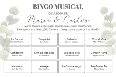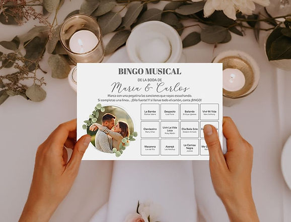 Cada cartón se personaliza con la lista de canciones elegidas. Si eres cliente de nuestras invitaciones, aplicaremos el mismo diseño para que todo tenga el mismo estilo.